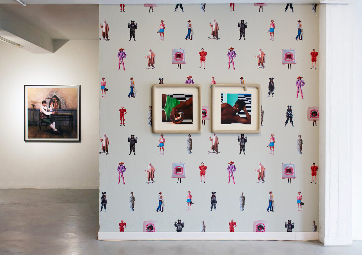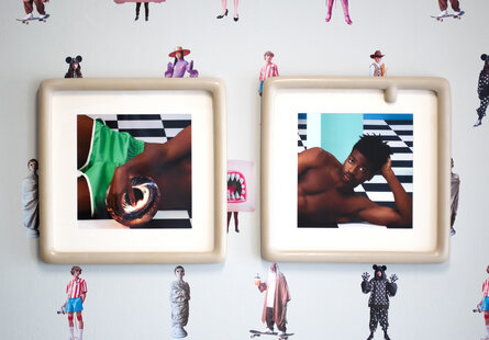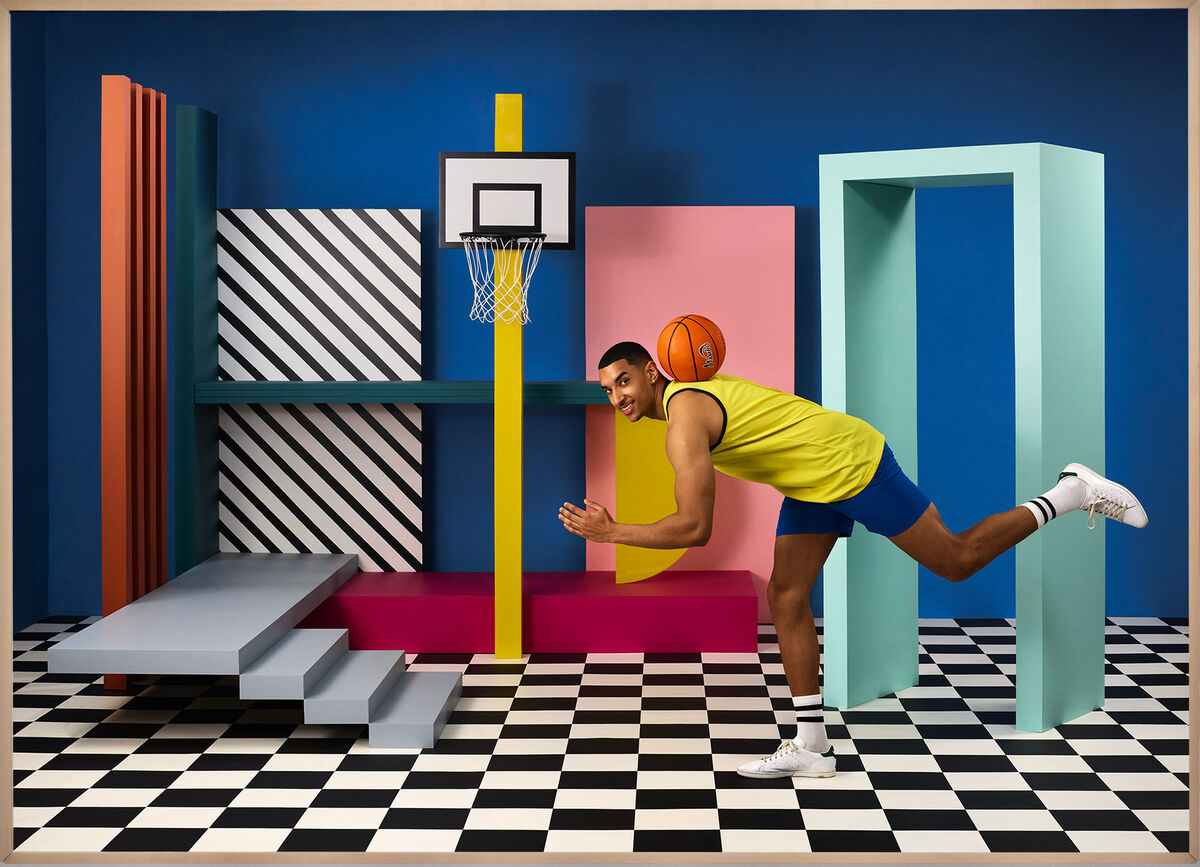 The photograph Mambo (2022) features a young model mid-pirouette with a basketball, set against a backdrop evoking the Memphis Group, geometric Art Deco, and 1960s Pop Art. Every element—architecture, costume, and props—holds symbolic meaning. A small basketball hoop at the center transforms the scene into a stylized youth tournament, subtly highlighting how images can reframe the ordinary and infuse it with new cultural significance.