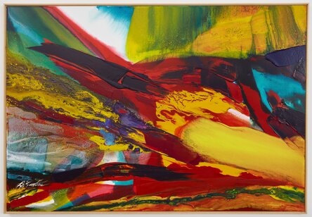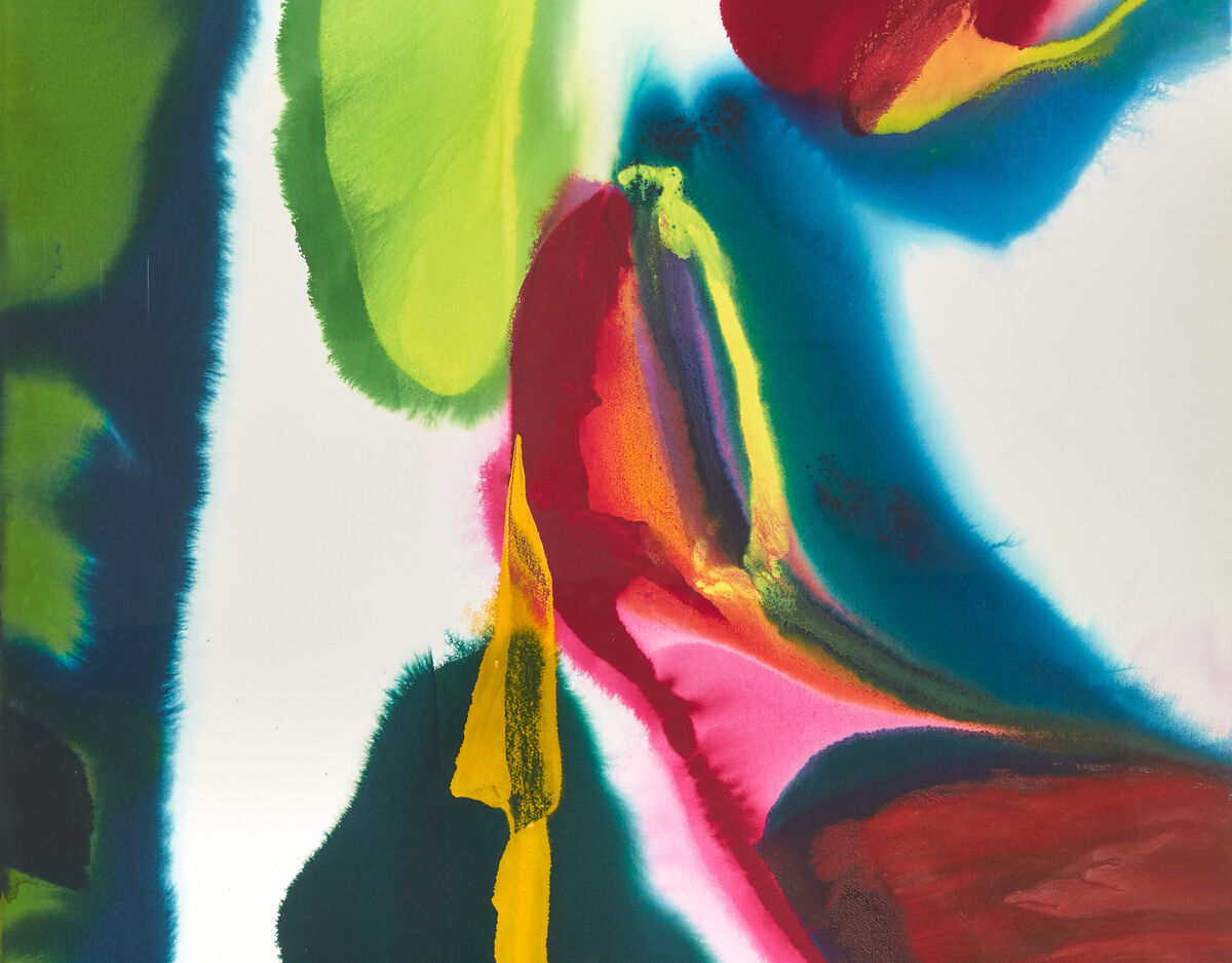 While engaged by the action painting techniques of his predecessors, Jenkins worked outside of gestural abstraction through his signature technique of controlled paint flow—manipulating poured pigment with an Inuit ivory knife rather than a brush—creating luminous, layered compositions that balanced spontaneity with a deep sense of control. This apparent absence of the artist's gestural mark upholds Jenkins' self-labelled title as an 'Abstract Phenomenist'.
