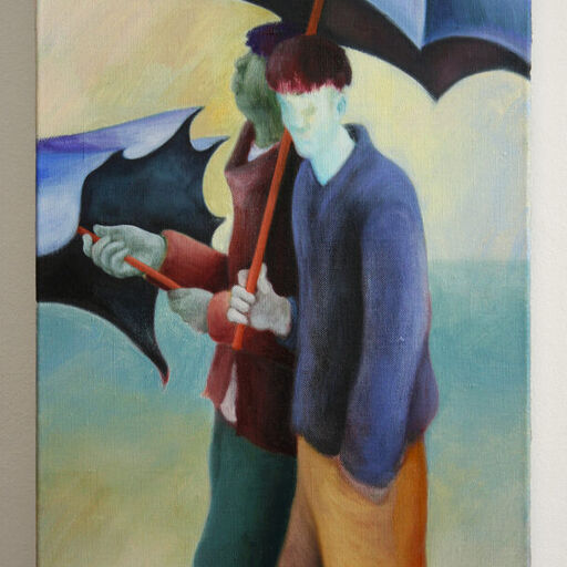 Dunnett creates enigmatic stories using placed figures that awkwardly meld and jar, framed inside scenes that appear to be staged. He merges traditional oil painting techniques with random reactions between household chemicals, building materials and found pigments.